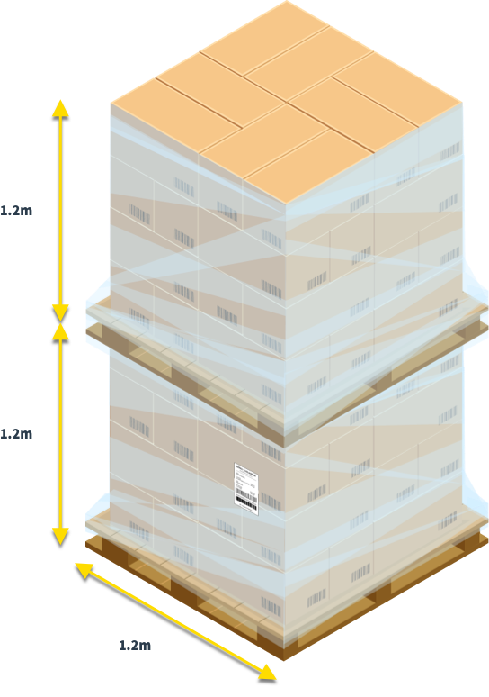 Two 1.2 pallets can be placed on top of each other where no damage can be caused to the product when this type of stacking occurs or on a mezzanine floor to minimise the potential for damage. This is a pallet space.